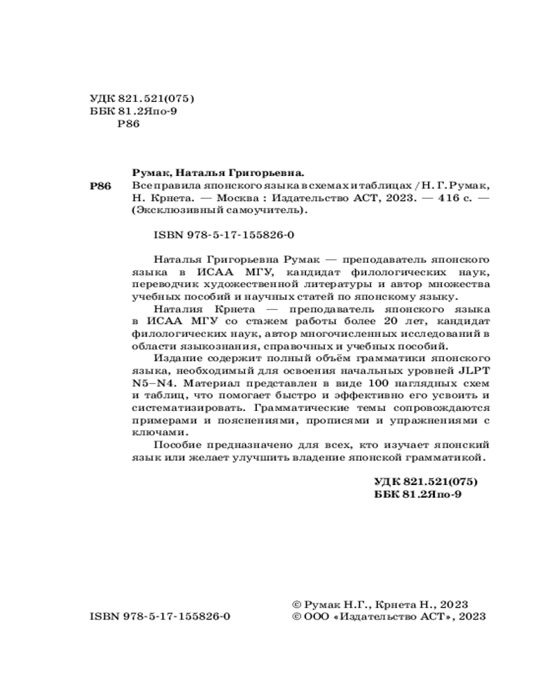 💳 Оплатить за товар можно при получении 🇰🇿 Есть бесплатная доставка по Казахстану 🎁 Копите бонусы с каждой покупки Серия: Эксклюзивный самоучитель Наталья Григорьевна Румак — преподаватель японского языка в ИСАА МГУ, кандидат филологических наук, переводчик художественной литературы и автор множества учебных пособий и научных статей по японскому языку. |
