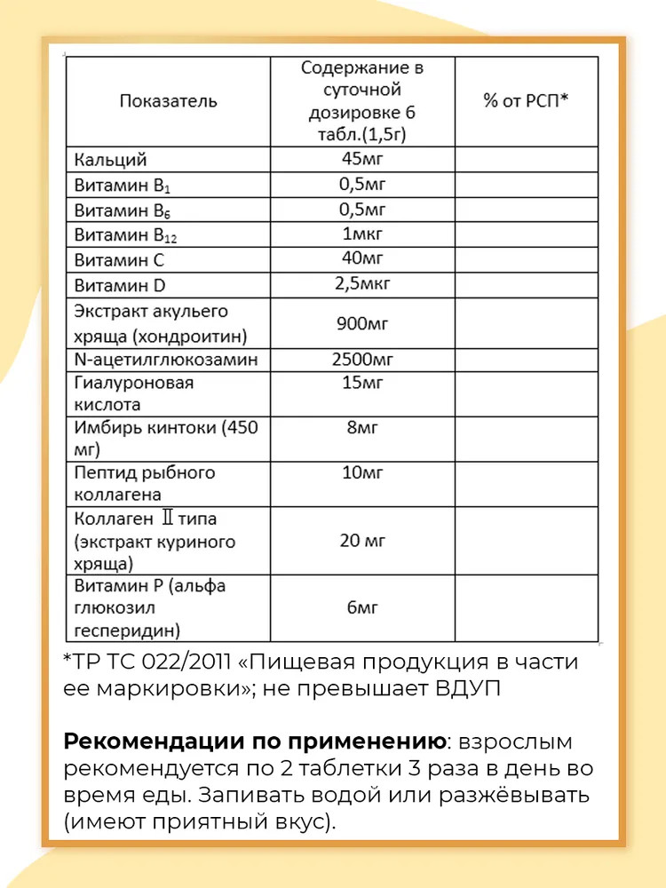 Супердобавка. Прекратились боли в коленях. Состоит их хрящей океанский рых и крабов, также присутсвуют хрящи курицы. Вкусные. Припивала сразу 12 штук в день (как рекомендовано производителем), хватило на месяц. В упаковке 360 штук. Очень жду поступления