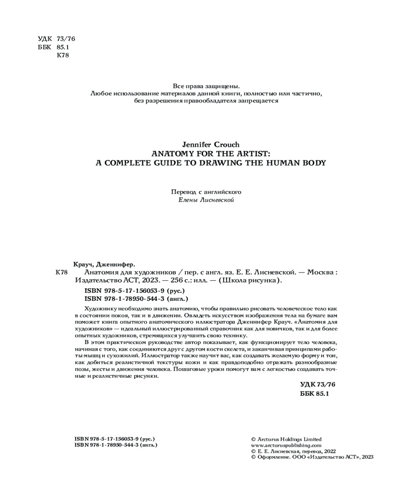 Серия: Школа рисунка Художнику необходимо знать анатомию, чтобы правильно рисовать человеческое тело как в состоянии покоя, так и в движении. Овладеть искусством изображения тела на бумаге вам поможет книга опытного анатомического иллюстратора Дженнифер Крауч. «Анатомия для художников» — идеальный иллюстрированный справочник как для новичков, так и для более опытных художников, стремящихся улучшить свою технику.