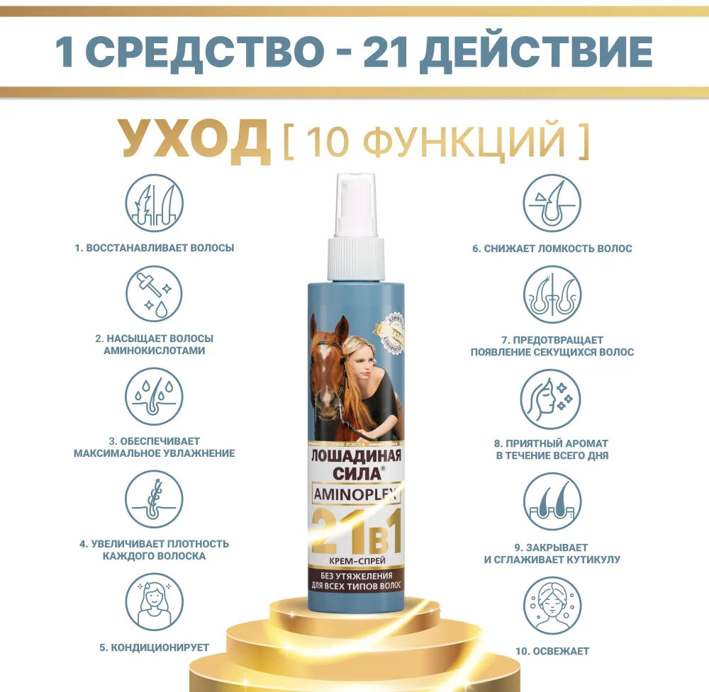 Профессиональный несмываемый многофункциональный спрей для волос — это уникальное средство, благодаря которому ваши волосы будут крепкими, здоровыми и ухоженными. Крем-спрей SOS Эликсир Aminoplex Лошадиная сила — многофункциональный несмываемый спрей для волос 21в1 — это 21 компонент, собранные в один продукт, которые сделают твои волосы гладкими и шелковистыми. Тебе больше не придется покупать кучу средств для профессионального ухода за волосами, ведь спрей совмещает в себе все самое необходимое. Это и восстановление и легкое расчесывание, термозащита и увлажнение, питание и много других приятных свойств.