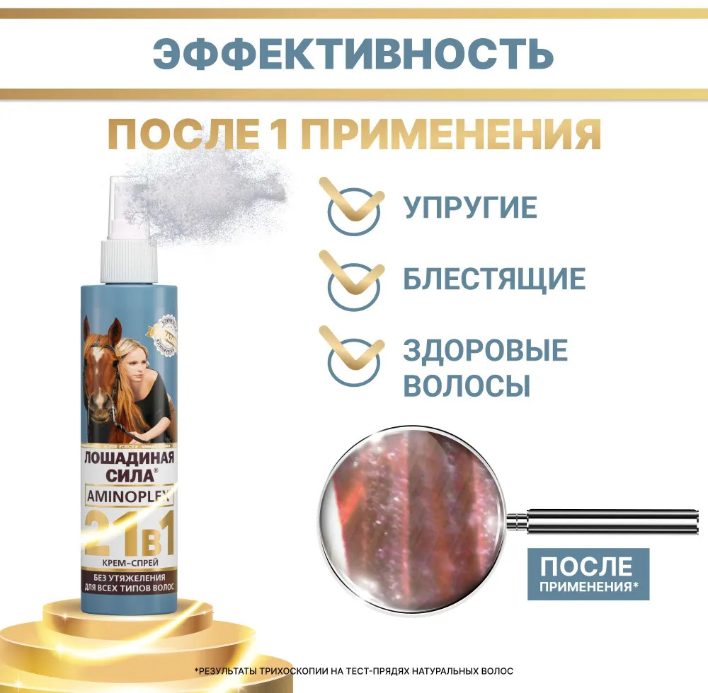 Уникальный запатентованный комплекс крем-спрея для волос «Лошадиная сила» — это незаменимое средство восстанавливает поврежденные волосы, насыщает их аминокислотами, увеличивая плотность каждого волоска. Закрывает и сглаживает кутикулу, предотвращает появление секущихся кончиков, снижает их ломкость. Оказывает увлажняющее действие на Ваши волосы, придает им глянцевый блеск, глакдость и шелковистость.