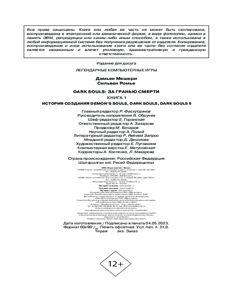 Эта книга позволит вам заглянуть за кулисы создания культовой франшизы. Дамьен Мешери и Сильвен Ромье описывают боевые механики и необычный лор, рассуждают о персонажах и сюжетах первых трех игр: Demon’s Souls, Dark Souls и Dark Souls II. Игровой процесс, вселенная, музыка, тематика, наследие — все изучено вплоть до мельчайших деталей.