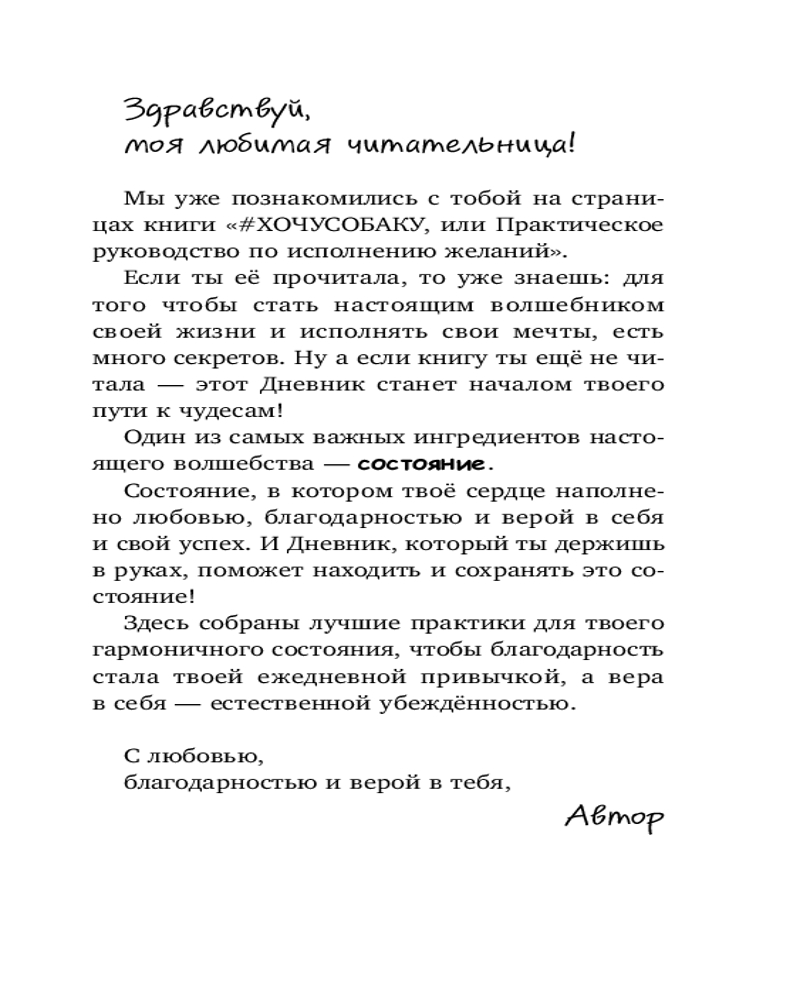 Этот дневник станет не только интересным, но и полезным досугом для ребенка. Дополнение к первой книге «#ХОЧУСОБАКУ, или Практическое руководство по исполнению желаний»! В серии также планируются «Практическое руководство по вдохновению» и «Карта желаний. Мечта сбудется!» |