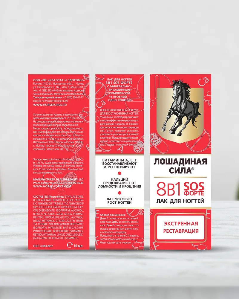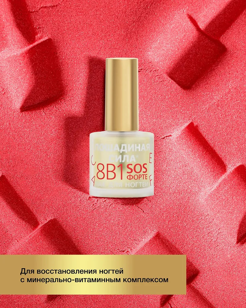 Лошадиная сила Лак для ногтей «8 в 1»В данный момент этот товар отсутствует в продаже. Возможно, у нас найдется аналогичный или похожий товар здесь. Лак для ногтей 8 в 1 SOS Форте — высокоэффективный продукт для восстановления ногтей с минерально-витаминным комплексом. Уникальное, многофункциональное и высокоэффективное средство для регенерации и защиты от внешних факторов и механических повреждений. Витамины А, E, F восстанавливают и регенерируют. Кальций предохраняет от ломкости и крошения. |