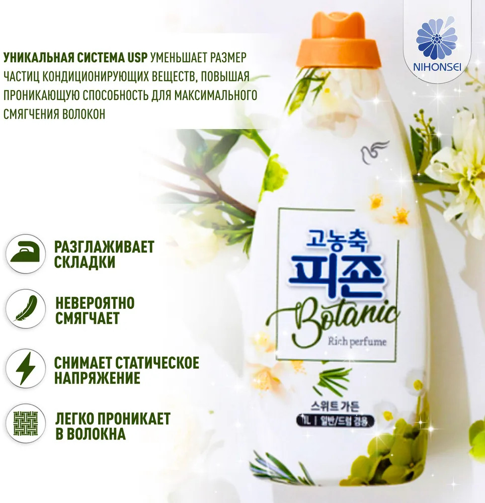 Кондиционер с прекрасным ароматом женственным ароматом цветущего букета предназначен для хлопка, льна, шерсти, синтетических тканей и стиральных машин активаторного и барабанного типов. B 3 раза более концентрированный по сравнению с обычным кондиционером Pigeon. Смягчает, разглаживает складки, снимает статическое напряжение, облегчает процесс глаженья. НЕ содержит 13 вредных компонентов — PHMG, PHMB, PGH (антибактериальных компонентов), CMIT, MIT (производные консерванта метилизотиазолинона), метилпарабен, триклозан, бензол, формальдегид, флуоресцентные отбеливатели, красители и др. Дерматологически протестирован Dermapro в стране-производителе. В верхних нотах вы услышите ароматы апельсина, трав и зелени, в сердце вам откроются жасмин, роза и ландыш, а в шлейфе — мускус, дерево и пудра.