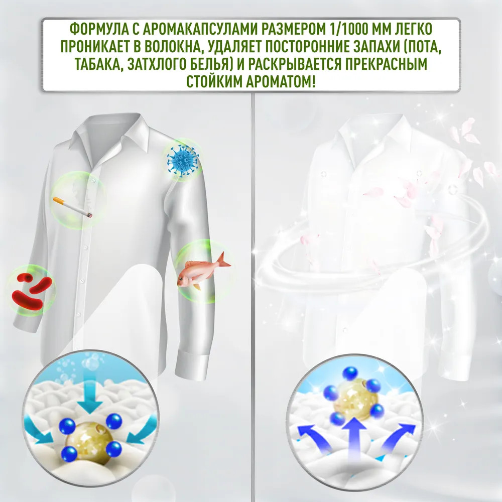 Способ использования и меры предосторожности: добавить в отделение для кондиционера или в воду при последнем полоскании. Перед первым применением проверить устойчивость красителя ткани, нанеся кондиционер на незаметном месте с последующим полосканием. Использовать по назначению. При чувствительной коже надевать резиновые перчатки. Беречь от детей, тепла, прямых солнечных лучей! Не наливать средство непосредственно на ткани, не смешивать со стиральным порошком и отбеливателем. При попадании в глаза, сразу промыть их водой. При случайном проглатывании — выпить большое количество воды. При ухудшении самочувствия — обратиться к врачу.