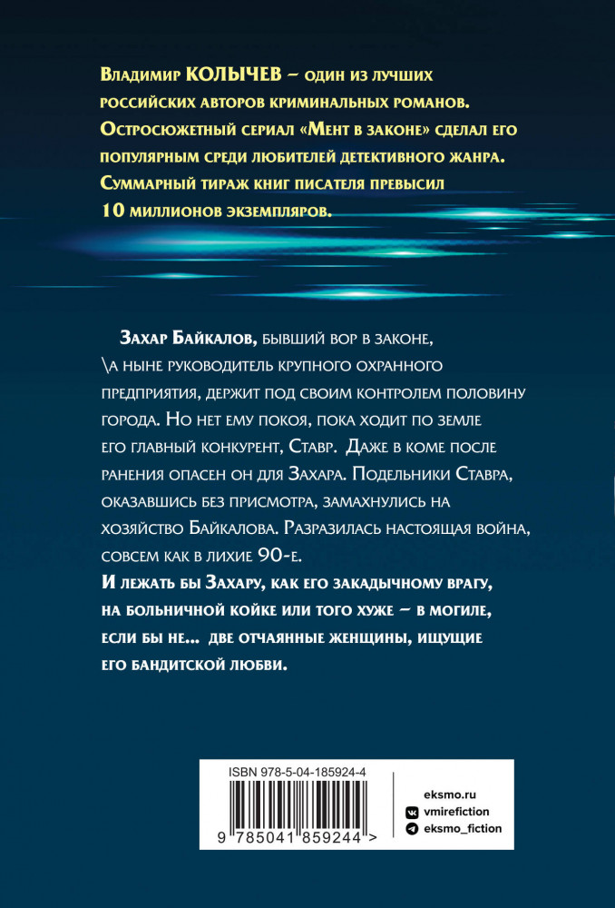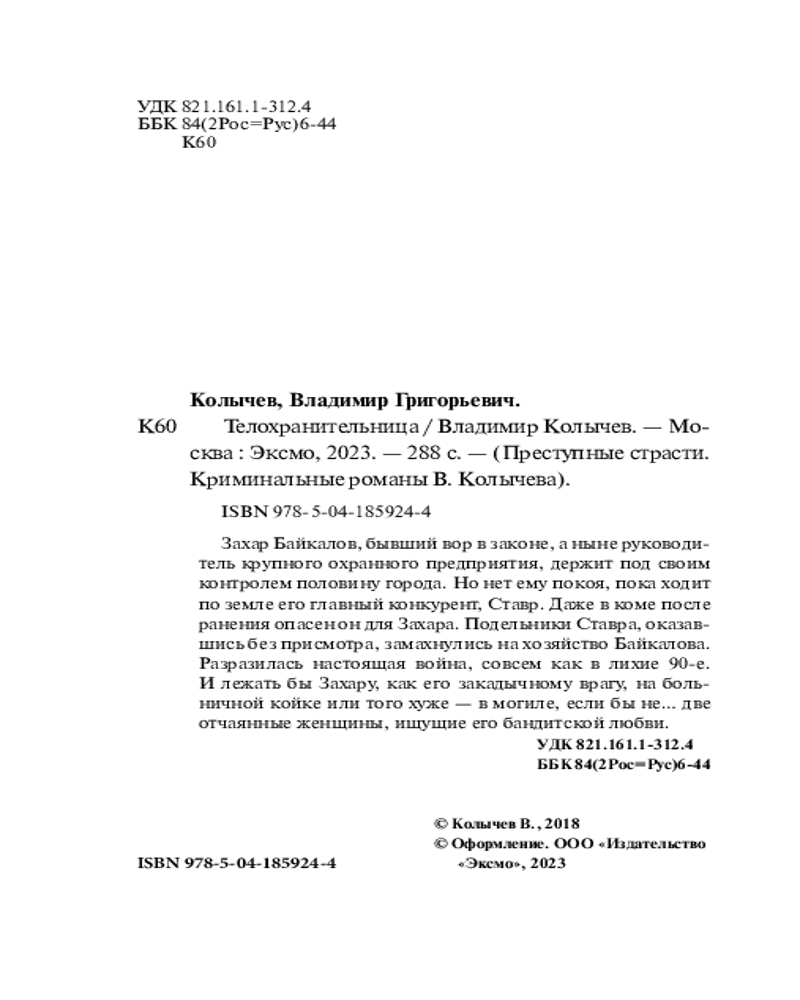 ТелохранительницаВ данный момент этот товар отсутствует в продаже. Возможно, у нас найдется аналогичный или похожий товар здесь. Серия: Преступные страсти. Криминальные романы В.Колычева Захар Байкалов, бывший вор в законе, а ныне руководитель крупного охранного предприятия, держит под своим контролем половину города. Но нет ему покоя, пока ходит по земле его главный конкурент, Ставр. Даже в коме после ранения опасен он для Захара. Подельники Ставра, оказавшись без присмотра, замахнулись на хозяйство Байкалова. Разразилась настоящая война, совсем как в лихие 90-е. И лежать бы Захару, как его закадычному врагу, на больничной койке или того хуже — в могиле, если бы не... две отчаянные женщины, ищущие его бандитской любви. |