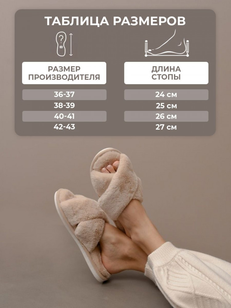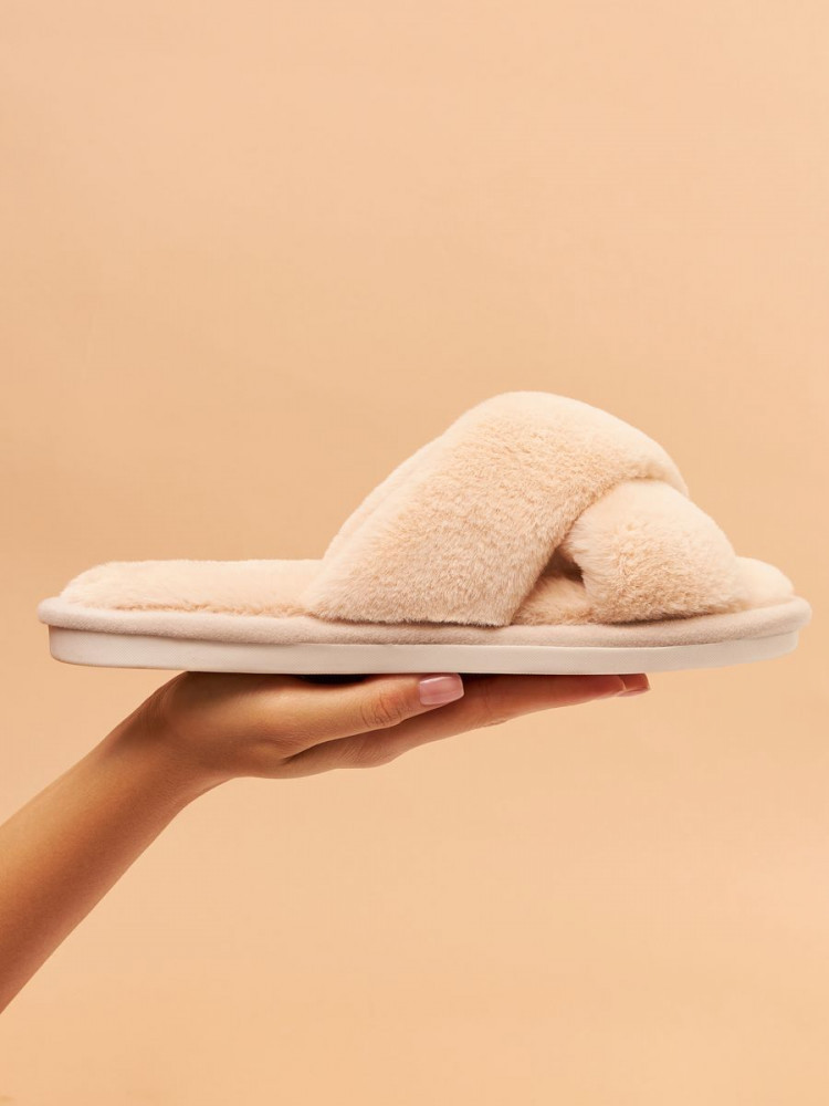 Уютные меховые тапочки с двумя перекрестными ремешками — это лучший вариант домашней обуви на каждый день. Тапочки с открытым носом выполнены из искусственного меха, в их производстве не использовался мех животных. Тапки оснащены противоскользящей подошвой из ПВХ и удобной стелькой с массажным эффектом. Это способствует снятию усталости и делает их такими же удобными, как ортопедическая обувь. Такая модель легких тапок подарит комфорт вашим гостям и дома, и на даче. Красивые тапочки дополнят наряд подружки невесты на пижамной вечеринке. Милые тапочки продаются в 6 нюдовых цветах, имеют большую сетку размеров и подходят на широкую ногу.