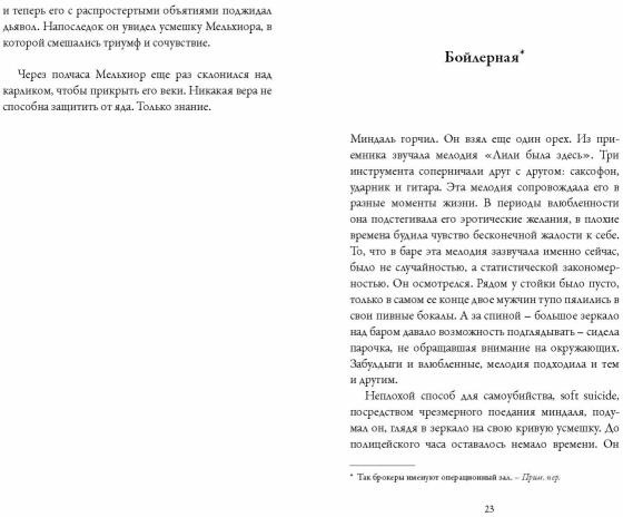 Верденберговские рассказы короткие, написанные нарочито холодным языком, за которым угадывается тонкая ирония, это не только безделица, помогающая читателю развлечься, погрузившись в мир чужих страстей, преступлений и наказаний. Они заставляют задуматься. Особо стоит сказать о переводчике этой и других книг Верденберга, Борисе Хлебникове (в его переводах публиковались произведения Гофмана, Гессе, Бёлля, Грасса, Шлинка и др.): именно благодаря ему Мельхиор Верденберг заговорил со своими читателями и по-русски. |