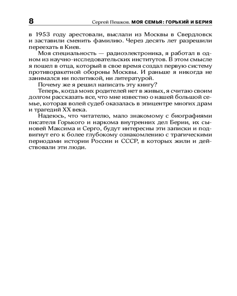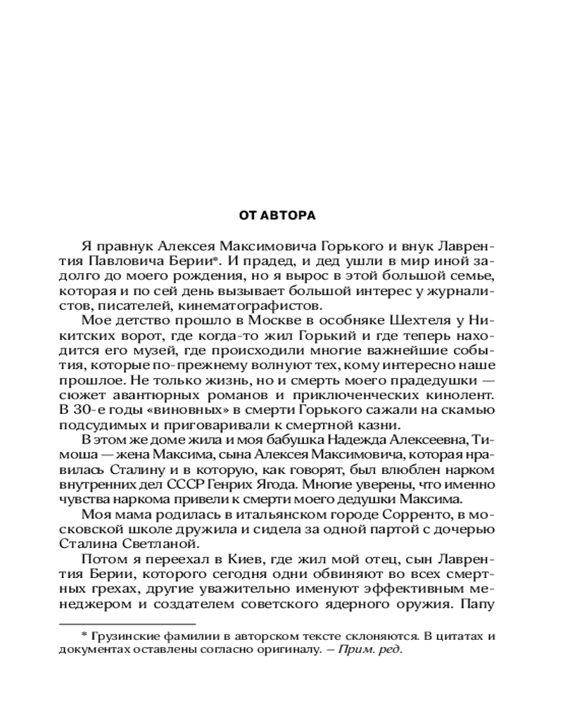 Автор этой книги — правнук Алексея Максимовича Горького и внук Лаврентия Павловича Берии. И его прадед, и его дед ушли в мир иной до его рождения, но он вырос в этой большой семье, которая и по сей день вызывает большой интерес у журналистов, писателей, кинематографистов. Его детство прошло в Москве в особняке Шехтеля у Никитских ворот, где когда-то жил Горький и где теперь находится его музей, где происходили многие важнейшие события, которые по-прежнему волнуют тех, кому интересно наше прошлое. Не только жизнь, но и смерть его прадедушки — сюжет авантюрных романов и приключенческих кинолент. В 30-е годы «виновных» в смерти Горького сажали на скамью подсудимых и приговаривали к смертной казни. Почему он решил написать эту книгу? Потому что теперь, когда его родителей нет в живых, он посчитал своим долгом рассказать все, что ему известно о своей семье, которая волей судеб оказалась в эпицентре многих драм и трагедий ХХ века. |