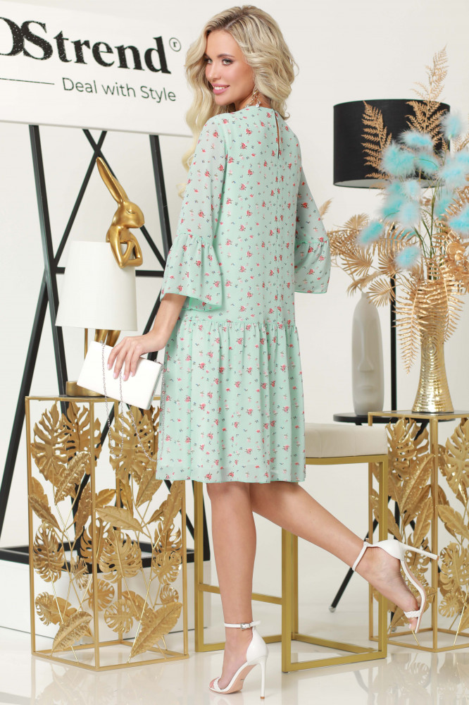Платье шифоновое, лёгкое, милое и нежное. Отличный летний вариант. Имеется синтетический подклад белого цвета, но он не утяжеляет платье. Очень понравилось платье, но к сожалению на мне смотрится не очень. Фигура не стандартная и рост не высокий. По сути у меня 50 размер, если судить по размерной сетке. Такое платье и купила, но из-за того, что у меня широкий плечевой пояс, вверху и в верхней части руки платье впритык и мне немного не комфортно. В районе талии и бедер платье очень свободное и добавляет объема. Длина платья на мой рост 160 ниже колен. Не смотря на то, что мне не совсем подошёл этот фасон, платье заслуживает пяти звёзд. Платье оставила, в любом случае носить буду, понравилась расцветка и ткань.