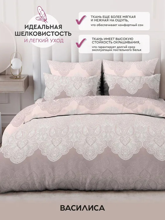 Комплект постельного белья создан из ткани бязь — гипоаллергенного, экологичного, высококачественного, крупнозакрученного волокна, благодаря чему эта ткань мягкая, нежная на ощупь и очень прочная, не образует катышков на поверхности. При соблюдении рекомендаций по уходу, это белье выдерживает много стирок (более 70), не линяет и не теряет свою первоначальную прочность. Бесшовное постельное белье «Василиса» — это высококачественный сертифицированный продукт.