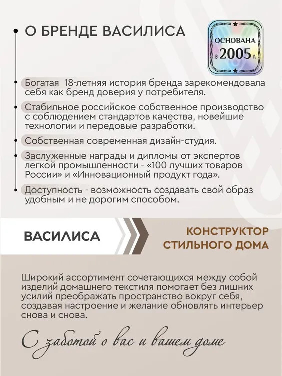 Дом — это место, где мы находим уют и покой, и домашний текстиль играет важную роль в создании комфорта и атмосферы в нашем жилище. Бренд «Василиса» предлагает широкий ассортимент постельного белья, скатертей, полотенец, покрывал, штор, декоративный текстиль и многое другое. Продукция изготовлена из высококачественных материалов, что обеспечивает ее прочность и долговечность. Наша продукция проходит строгий контроль качества, чтобы удовлетворить самые высокие стандарты и ожидания наших...