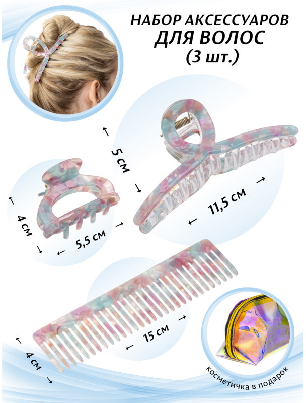 В набор крабов вошли 2 стильные заколки зажимы для волос разных форм, размеров и расческа: заколка краб большой 11.5 см * 5 см, заколка краб средний 5.5 см * 4 см, расческа для волос 15 см * 4 см. Аксессуары для волос имеют разные формы и декоративные элементы: классические, бабочки, ракушки, завитки, с прорезями и многие другие.