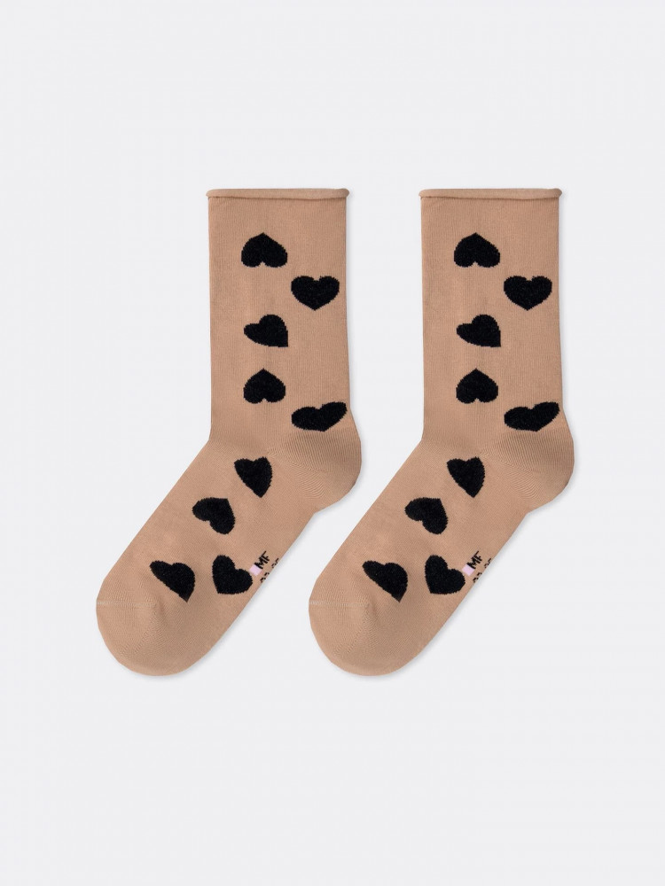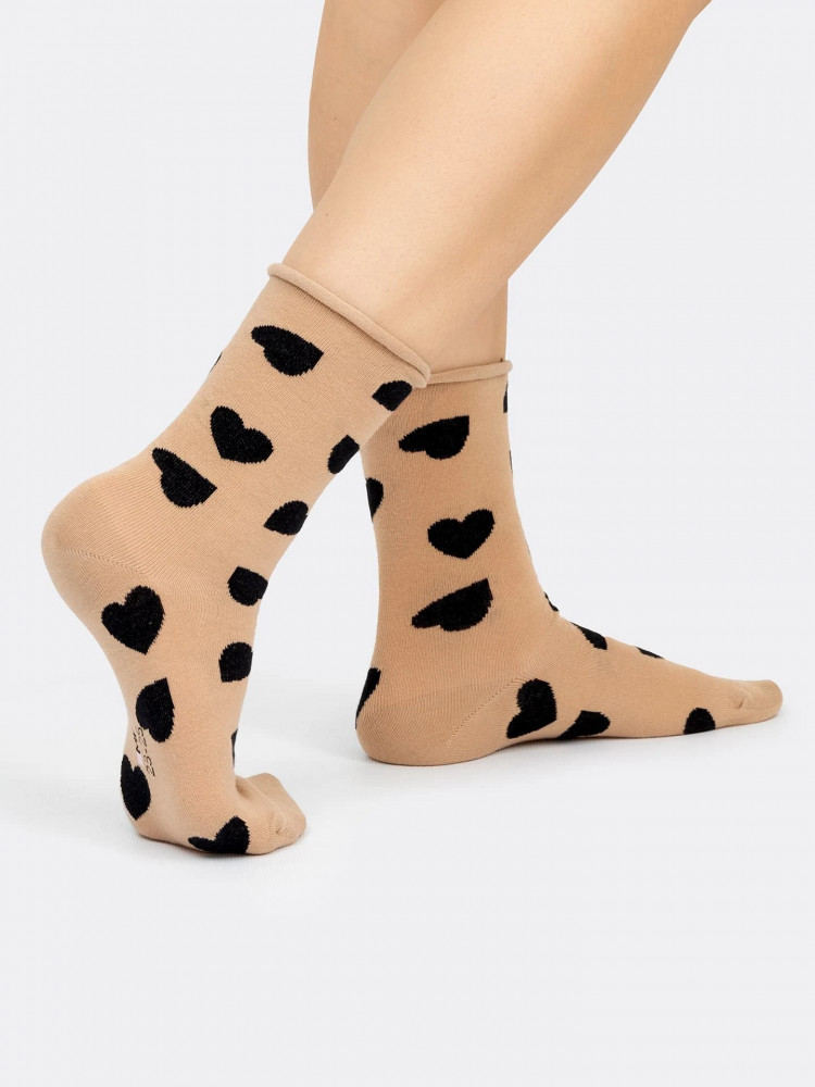 Тоненькие, хлопковые носочки. Подошли на 40 размер( 26 см). Высокие и без резинки,что особенно важно. Рекомендую. А сердечки это вообще красота