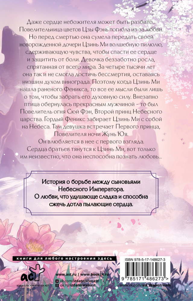 💳 Оплатить за товар можно при получении 🇰🇿 Есть бесплатная доставка по Казахстану от 1 дня 🎁 Копите бонусы с каждой покупки Серия: Хиты Китая. Фэнтези Даже сердце небожителя может быть разбито... Повелительница цветов Цзы Фэнь погибла из-за любви. Но перед смертью она сумела передать своей новорожденной дочери Цзинь Ми волшебную пилюлю, сдерживающую чувства, чтобы спасти ее сердце и защитить от боли. Девочка беззаботно росла, спрятанная от всего мира. За четыре тысячи лет она так и не смогла достичь бессмертия, оставаясь низшим духом вино-града. Поэтому когда Цзинь Ми нашла раненого Феникса, то все ее мысли были лишь о том, чтобы забрать его духовную силу. Внезапно птица обернулась прекрасным мужчиной — то был Повелитель огня Сюй Фэн, Второй принц Небесного царства. Гордый Феникс забирает Цзинь Ми с собой на Небеса. Там девушка встречает Первого принца, Повелителя ночи Жунь Юя. Он влюбляется в нее с первого взгляда. Сердца братьев тянутся к Цзинь Ми, вот только им неизвестно, что она неспособна познать любовь... |