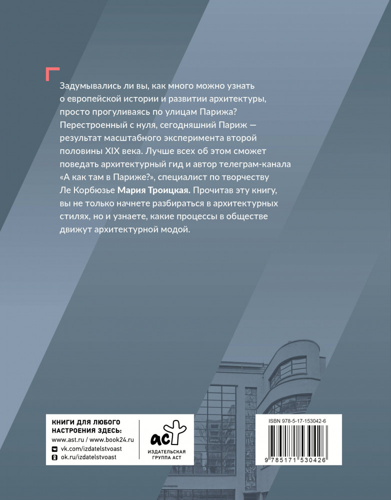 💳 Оплатить за товар можно при получении 🇰🇿 Есть бесплатная доставка по Казахстану от 1 дня 🎁 Копите бонусы с каждой покупки Серия: пАРТер Задумались ли вы, как много можно узнать о европейской истории и развитии архитектуры, просто прогуливаясь по улицам Парижа? Перестроенный с нуля, сегодняшний Париж — результат масштабного эксперимента второй половины XIX века. Лучше всех об этом сможет поведать архитектурный гид и автор телеграм-канала «А как там в Париже?», специалист по творчеству Ле Корбюзье, Мария Троицкая. Прочитав эту книгу, вы не только начнете разбираться в архитектурных стилях, но и узнаете, какие процессы в обществе движут архитектурной модой. |