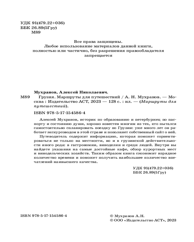 💳 Оплатить за товар можно при получении 🇰🇿 Есть бесплатная доставка по Казахстану от 1 дня 🎁 Копите бонусы с каждой покупки Серия: Маршруты для путешествий. Путеводители Алексей Мухранов, историк по образованию и петербуржец по паспорту и состоянию души, хорошо известен многим из тех, кто пытался самостоятельно спланировать поездку по Грузии: уже много лет он работает экскурсоводом в этой стране и пополняет собственный сайт о ней. |