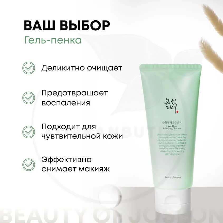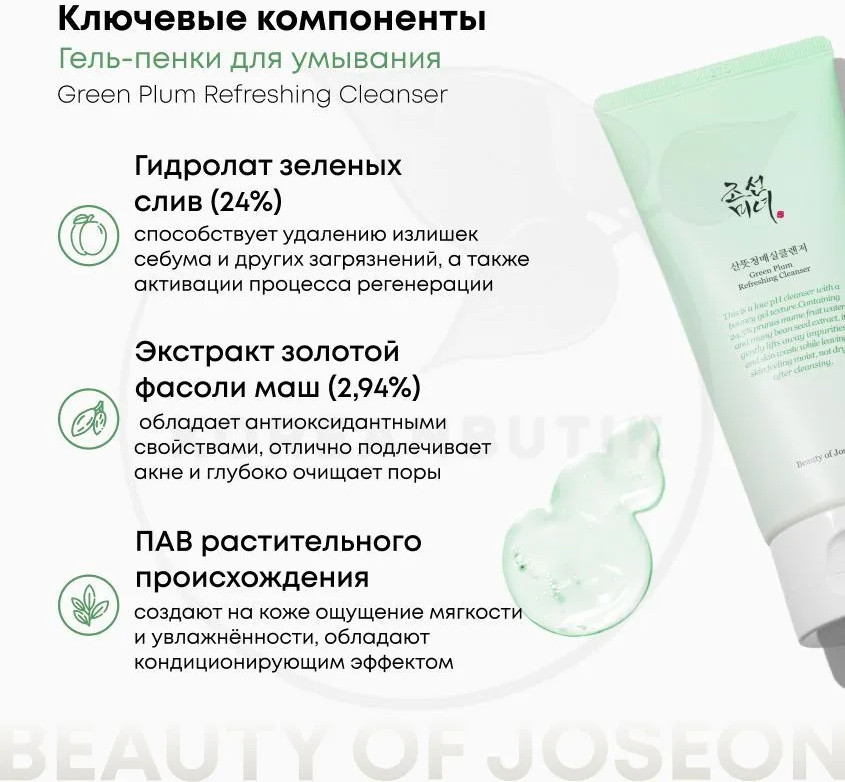 Beauty of Joseon Гель-пенка для умывания с зелёной сливойВ данный момент этот товар отсутствует в продаже. Возможно, у нас найдется аналогичный или похожий товар здесь. Освежающий гель для умывания с зелёной сливой Beauty of Joseon Green Plum Refreshing Cleanser мягко и деликатно отшелушивает ороговевший слой эпидермиса, смягчает и выравнивает рельеф, нежно очищает от всех загрязнений, не провоцируя сухости и стянутости. Содержит экстракт фасоли маш, листьев зелёного чая, хауттюйнии, лотоса и риса. |