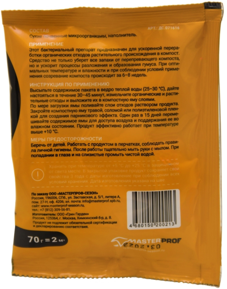MasterProf Ускоритель компостаВ данный момент этот товар отсутствует в продаже. Возможно, у нас найдется аналогичный или похожий товар здесь. Этот бактериальный препарат предназначен для ускоренной переработки органических отходов растительного происхождения в компост. Средство не только уберет все запахи от перепревающего компоста, но и ускорит процессы разложения и образования гумуса. Бактериальный препарат предназначен для ускоренной переработки органических отходов растительного происхождения в компост. Средство не только уберет все запахи от перепревающего компоста, но и ускорит процессы разложения и образования гумуса. |