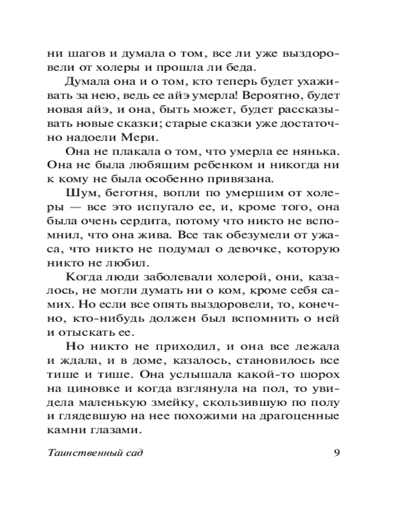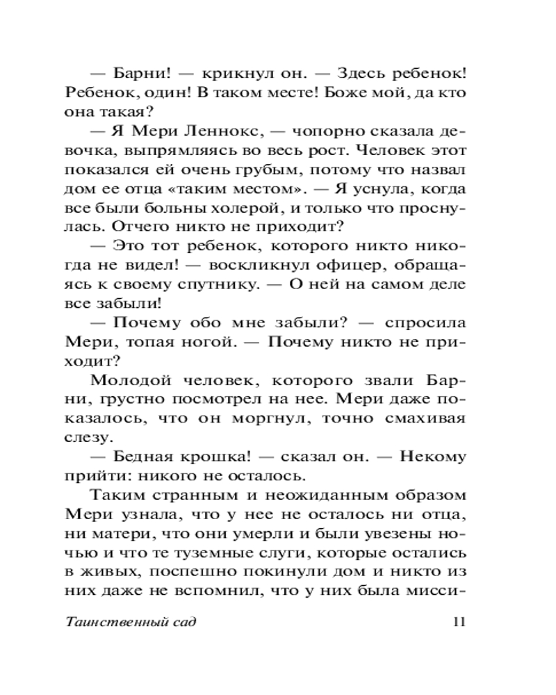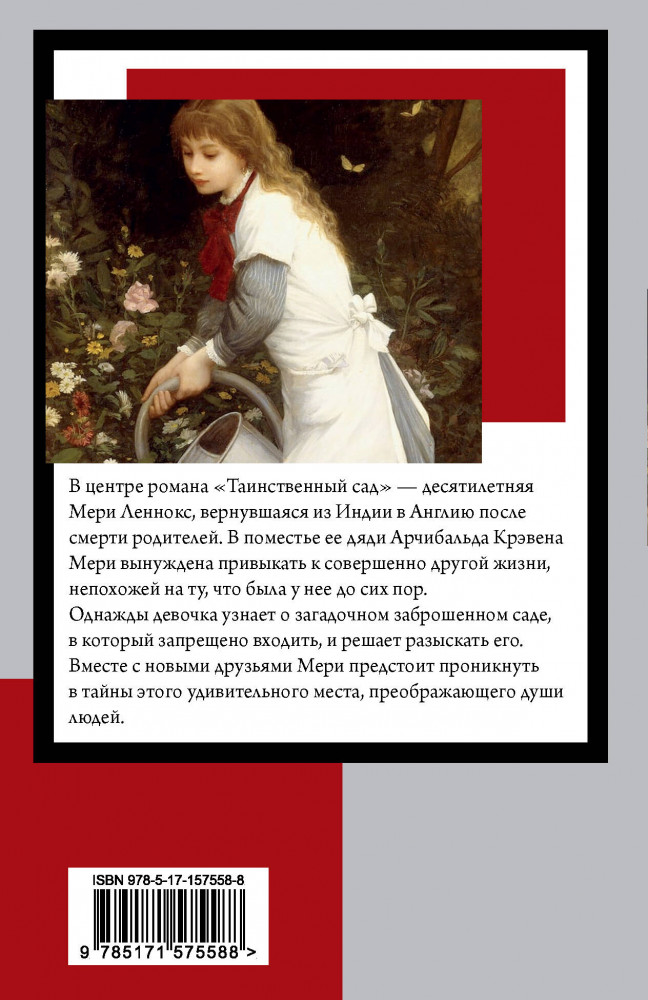 Таинственный садинтересный сюжет компактный формат крупный шрифт хорошее состояние В данный момент этот товар отсутствует в продаже. Возможно, у нас найдется аналогичный или похожий товар здесь. Серия: Книга на все времена (нов/м) В центре романа «Таинственный сад» — десятилетняя Мери Леннокс, вернувшаяся из Индии в Англию после смерти родителей. В поместье ее дяди Арчибальда Крэвена Мери вынуждена привыкать к совершенно другой жизни, непохожей на ту, что была у нее до сих пор. |