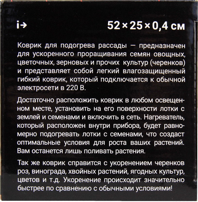 MasterProf Коврик для подогрева рассадыВ данный момент этот товар отсутствует в продаже. Возможно, у нас найдется аналогичный или похожий товар здесь. Идеален для проращивания семян и поддержания комфортной температуры рассады в холодный период времени. Тепловое излучение оказывает положительный эффект на выращиваемые культуры: улучшает рост корневой системы, повышает устойчивость рассады к пересадке. Правильный нагрев увеличивает всхожесть на 30-50%. Работает от сети 200Вт. |
