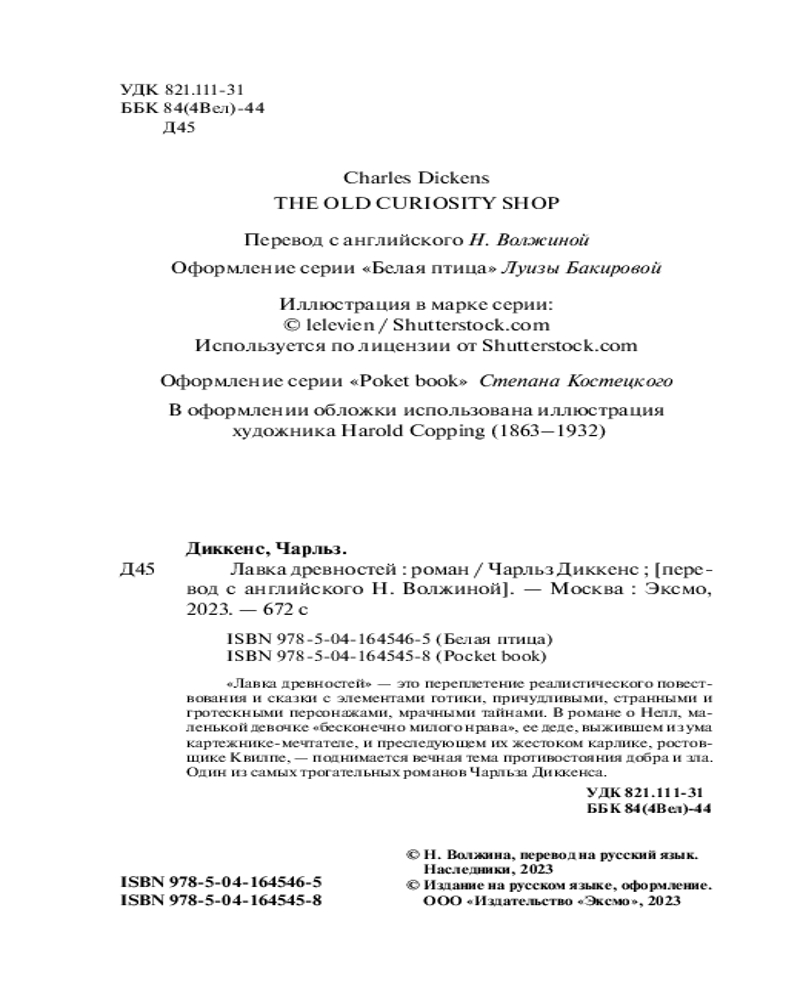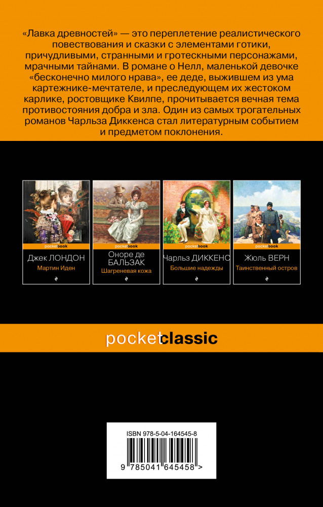 💳 Оплатить за товар можно при получении 🇰🇿 Есть бесплатная доставка по Казахстану от 1 дня 🎁 Копите бонусы с каждой покупки Серия: Pocket Book (обложка) «Лавка древностей» — это переплетение реалистического повествования и сказки с элементами готики, причудливыми, странными и гротескными персонажами, мрачными тайнами. В романе о Нелл, маленькой девочке «бесконечно милого нрава», ее деде, выжившем из ума картежнике-мечтателе, и преследующем их жестоком карлике, ростовщике Квилпе, поднимается вечная тема противостояния добра и зла. Один из самых трогательных романов Чарльза Диккенса. |