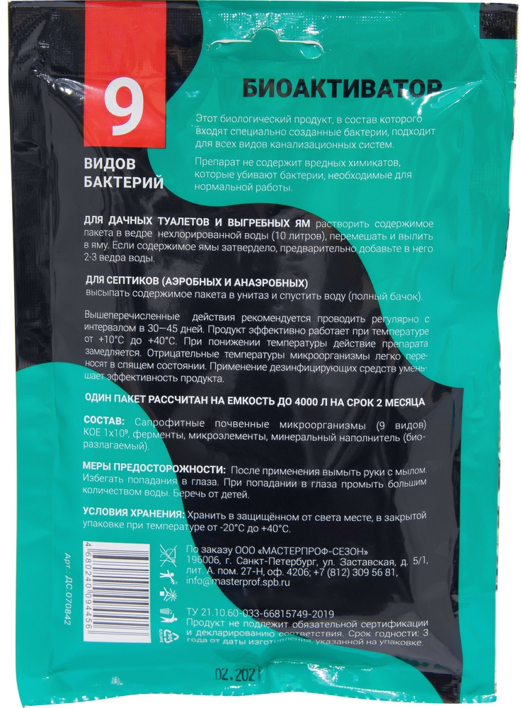 MasterProf Биоактиватор для септических системрезультат переработка норм В данный момент этот товар отсутствует в продаже. Возможно, у нас найдется аналогичный или похожий товар здесь. Биоактиватор для септических систем, канализационных резервуаров и выгребных ям предназначен для всех видов канализационных систем (аэробных и анаэробных). Так же подходит для запуска канализационных систем. Эффективно разлагает органические вещества, фекалии, жиры на углекислый газ и воду. Уменьшает объём твёрдых отходов и уничтожает неприятный запах. Безопасен для окружающей среды, занимает мало места при хранении. |