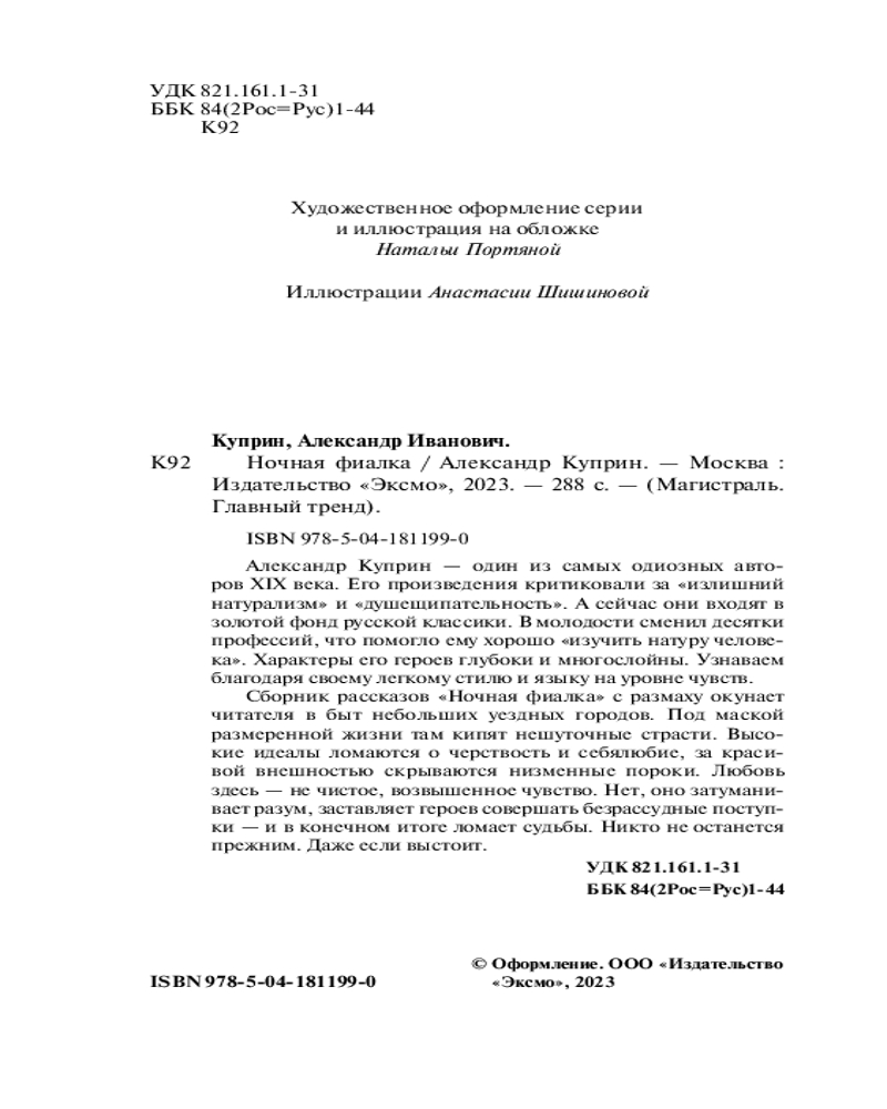«Ночная фиалка» Александра Куприна — это сборник увлекательных рассказов и повестей, окутанных атмосферой мистики и загадочности. Автор так умеет зачаровать читателя, что, читая любой рассказ, повесть или очерк, ты не можешь отпустить нить повествования и заинтригован до конца. Герои Куприна становятся настолько близкими, что ты начинаешь думать, как они, и раздвигаешь границы мира вместе с ними. Рекомендую к прочтению.