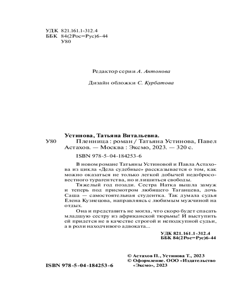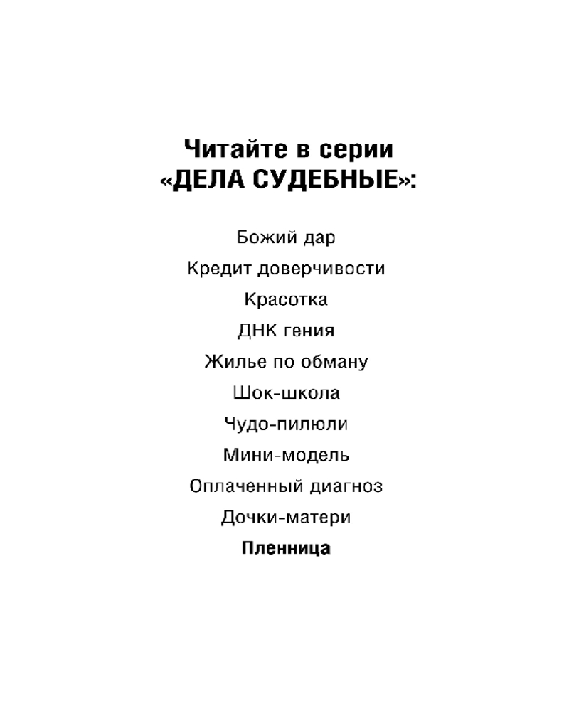 ПленницаПавел Алексеевич Астахов, Татьяна Витальевна Устинова В данный момент этот товар отсутствует в продаже. Возможно, у нас найдется аналогичный или похожий товар здесь. Серия: Дела судебные: Т. Устинова, П. Астахов Новая книга Татьяны Устиновой и Павла Астахова из авторского цикла «Дела судебные» — увлекательный остросюжетный роман, где житейские истории переплетаются с судебными делами. |