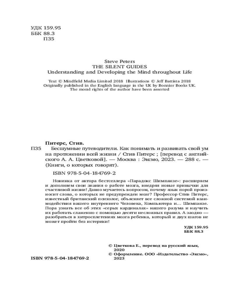 Бесшумные путеводители. Как понимать и развивать свой ум на протяжении всей жизниВ данный момент этот товар отсутствует в продаже. Возможно, у нас найдется аналогичный или похожий товар здесь. Серия: Книги, о которых говорят Кто сейчас у руля вашей жизни? Человек, компьютер или... шимпанзе? Откуда берутся привычки заедать стресс, волноваться по мелочам, недооценивать свои возможности? Ответы на эти вопросы вы найдете в новой книге профессора Стива Питерса. Автор предлагает легкую для понимания модель работы с бессознательными убеждениями и привычками, которая позволит жить счастливой и полной жизнью. |