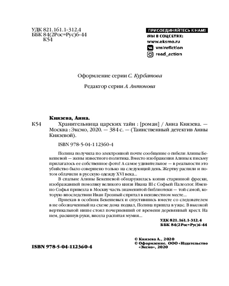 В остросюжетных романах Анны Князевой расследуются преступления, следы которых уводят в прошлое и позволяют пролить свет на его загадки. Вслед за героями вы отправитесь навстречу старинным тайнам и увлекательным приключениям! |