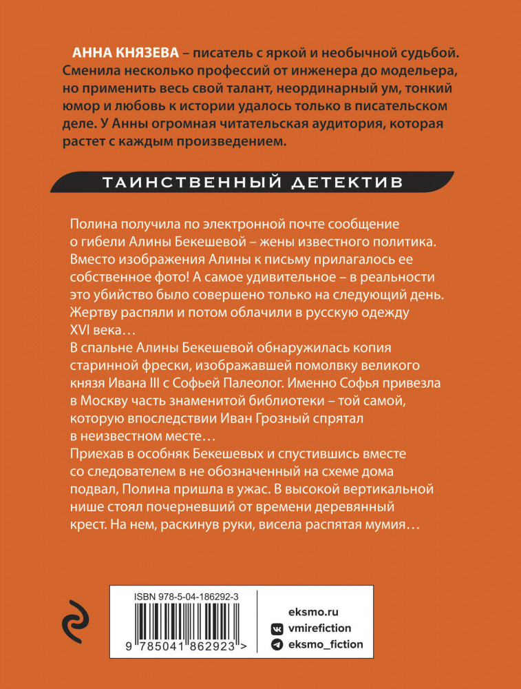В данный момент этот товар отсутствует в продаже. Возможно, у нас найдется аналогичный или похожий товар здесь. Серия: Таинственный детектив Анны Князевой. Новое оформление (обложка) Полина получила по электронной почте сообщение о гибели Алины Бекешевой — жены известного политика. Вместо изображения Алины к письму прилагалось ее собственное фото! А самое удивительное — в реальности это убийство было совершено только на следующий день. Жертву распяли и потом облачили в русскую одежду XVI века...