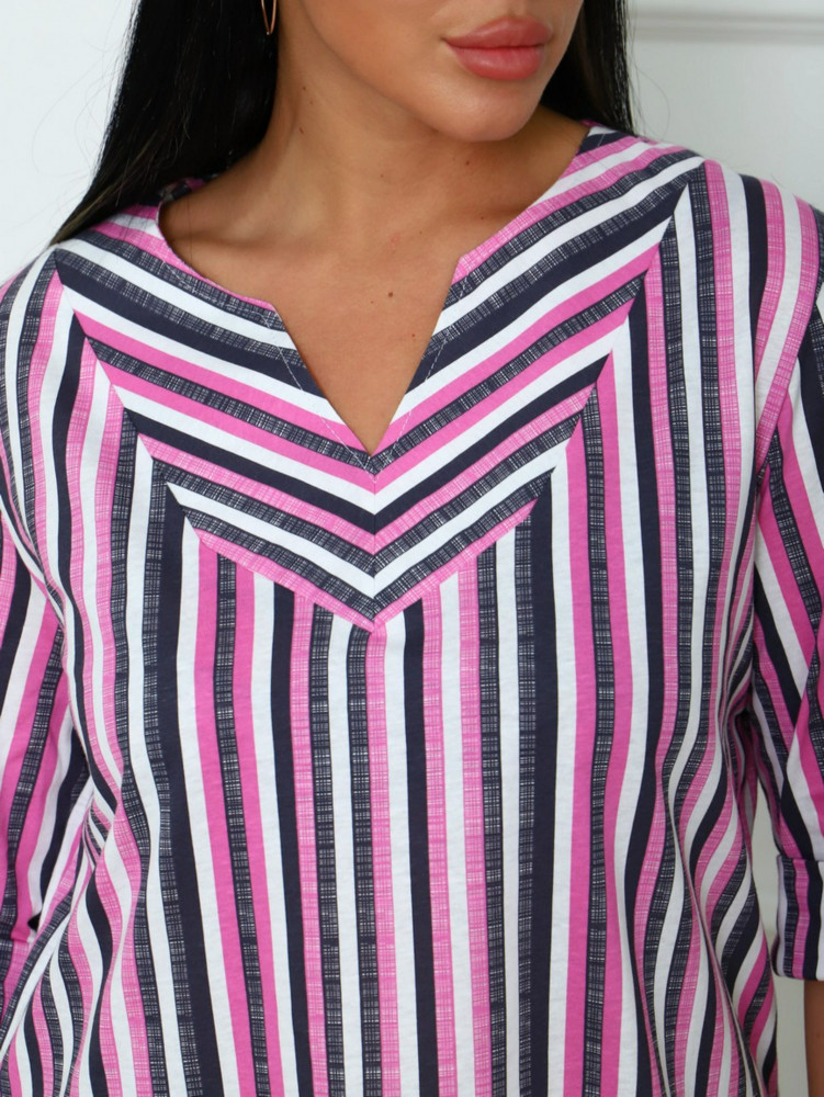отлично подошла по размеру и удобно села по фигуре...ткань плотная..приятная к телу... яркие синие полоски...мне понравилась