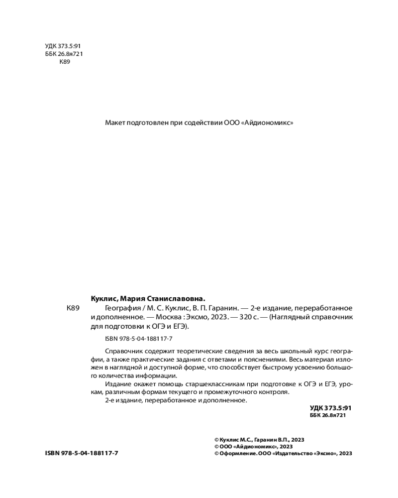 В данный момент этот товар отсутствует в продаже. Возможно, у нас найдется аналогичный или похожий товар здесь. Серия: Наглядный справочник для подготовки к ОГЭ и ЕГЭ (обложка) Справочник содержит важные материалы, которые помогут даже в сжатые сроки подготовиться к урокам, ЕГЭ по географии. Теория изложена в наглядной форме и дополняется блоком практических заданий c ответами для комплексного закрепления знаний.