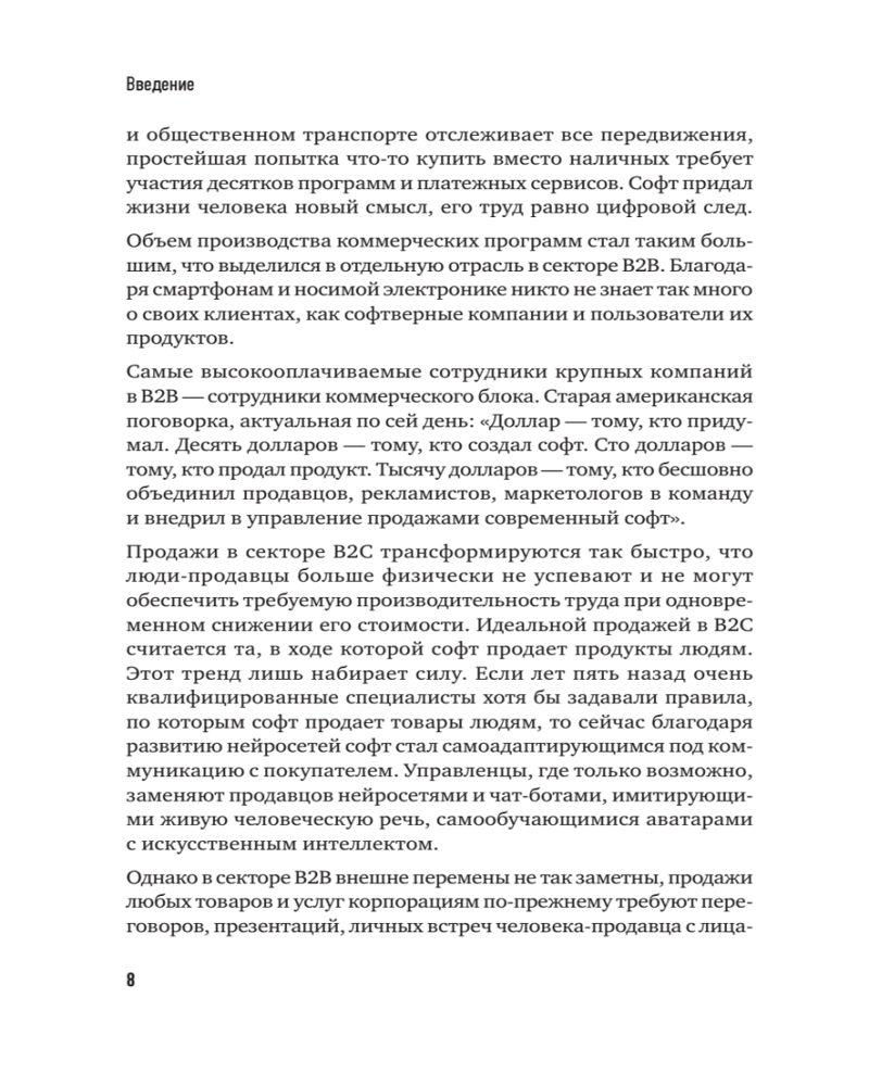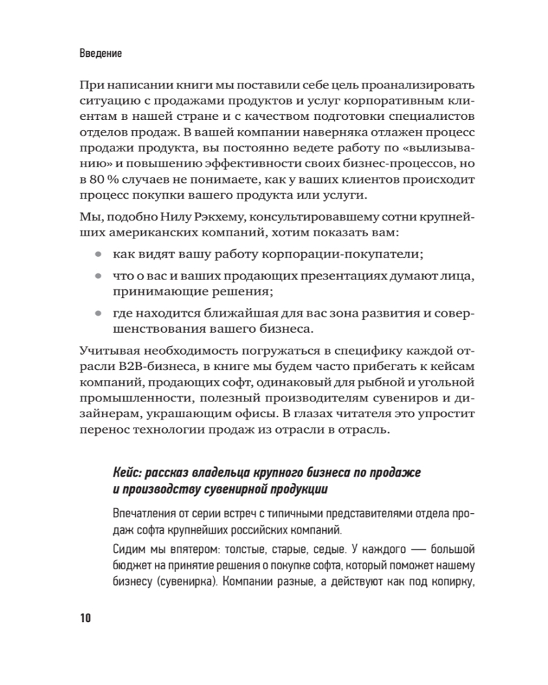 Технологии продаж B2B. Прокачиваем навыки продавцов на примере IT-сферыАндрей Ващенко, Евгений Колотилов В данный момент этот товар отсутствует в продаже. Возможно, у нас найдется аналогичный или похожий товар здесь. Серия: Бизнес-психология Сегодня продажи в секторе В2В требуют серьезных переговоров, презентаций и личных встреч человека-продавца с лицами, принимающими решения в конкретной компании. В связи с этим в компаниях, предлагающих свои продукты и услуги корпорациям, востребованы лучшие продавцы. Для решения поставленной задачи авторы предлагают продавцам оптовой коммерции взглянуть на свою работу со стороны корпораций-покупателей и узнать, что о них самих и об их продающих презентациях думают лица, принимающие решения. А также понять, где находится ближайшая зона развития и совершенствования бизнеса. |