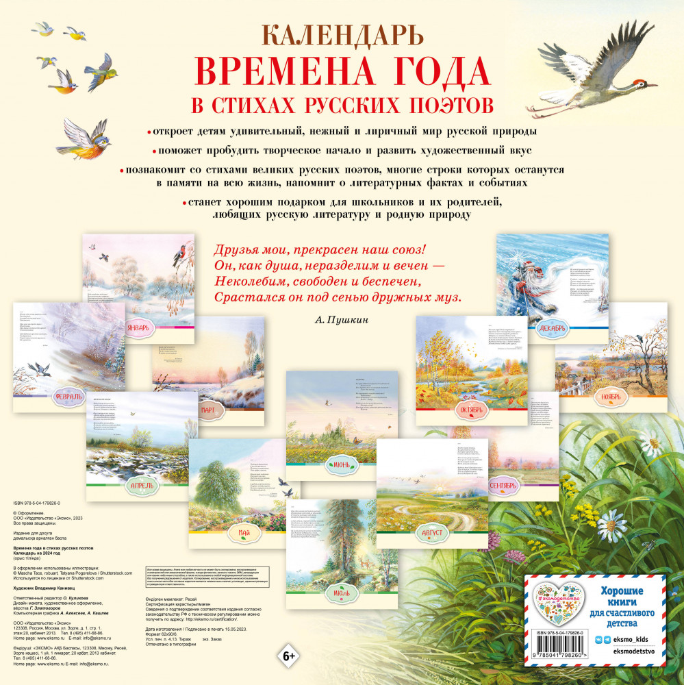 Календарь настенный на 2024 год «Времена года в стихах русских поэтов»В данный момент этот товар отсутствует в продаже. Возможно, у нас найдется аналогичный или похожий товар здесь. Серия: Календарь настенный детский Календарь «Времена года в стихах русских поэтов»: |