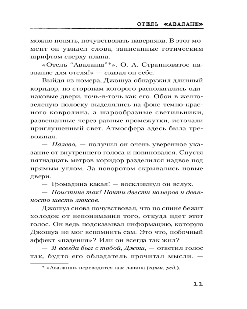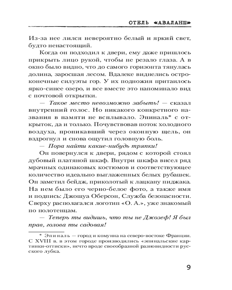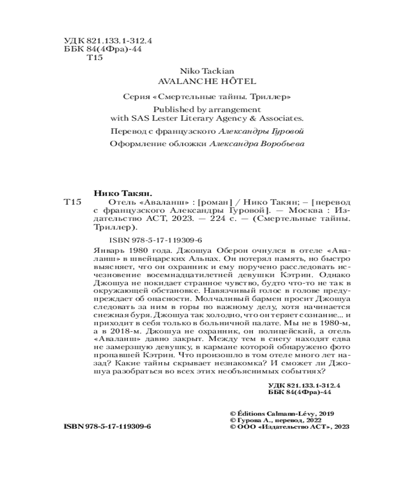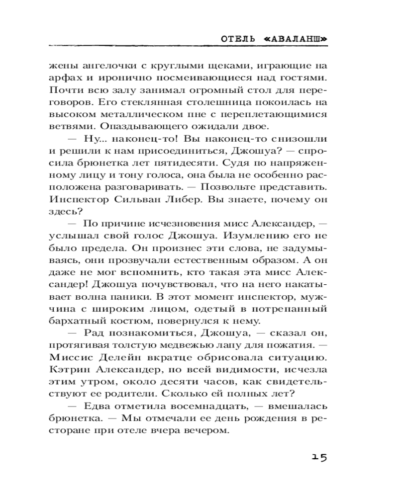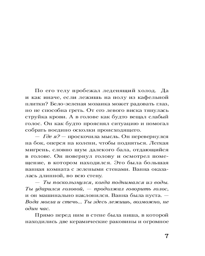 💳 Оплатить за товар можно при получении 🇰🇿 Есть бесплатная доставка по Казахстану от 1 дня 🎁 Копите бонусы с каждой покупки Серия: Смертельные тайны. Триллер Январь 1980 года. Джошуа Оберон очнулся в отеле «Аваланш» в швейцарских Альпах. Он потерял память, но быстро выясняет, что он охранник и ему поручено расследовать исчезновение восемнадцатилетней девушки Кэтрин. Однако Джошуа не покидает странное чувство, будто что-то не так в окружающей обстановке. Навязчивый голос в голове предупреждает об опасности. Молчаливый бармен просит Джошуа следовать за ним в горы по важному делу, хотя начинается снежная буря. Джошуа так холодно, что он теряет сознание... и приходит в себя только в больничной палате. Мы не в 1980-м, а в 2018-м. Джошуа не охранник, он полицейский, а отель «Аваланш» давно закрыт. Между тем в снегу находят едва не замерзшую девушку, в кармане которой обнаружено фото пропавшей Кэтрин. Что произошло в том отеле много лет назад? Какие тайны скрывает незнакомка? И сможет ли Джошуа разобраться во всех этих необъяснимых событиях? |