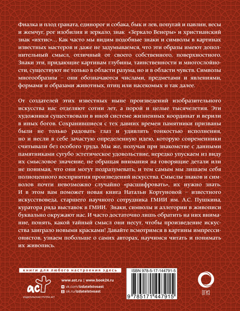 💳 Оплатить за товар можно при получении 🇰🇿 Есть бесплатная доставка по Казахстану от 1 дня 🎁 Копите бонусы с каждой покупки Серия: Искусство понимать Фиалка и плод граната, единорог и собака, бык и лев, попугай и павлин, весы и жемчуг, рог изобилия и зеркало, знак «Зеркало Венеры» и христианский знак «ихтис»... Как часто мы видим эти и другие знаки и символы в картинах известных мастеров и даже не задумываемся, что эти образы имеют дополнительный смысл, отличный от своего собственного, поверхностного. Знаки эти, придающие работам глубины, таинственности и многослойности, существуют не только в области разума, но и в области чувств. Символы многообразны — они обозначаются числами, предметами и явлениями, формами и образами животных, птиц или насекомых, и так далее. Особенно ярко символы проявляют себя в живописи и скульптуре. |