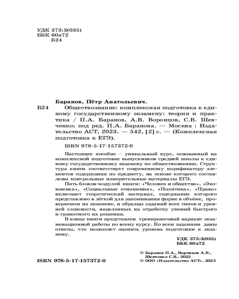 ЕГЭ. Обществознание. Комплексная подготовка к единому государственному экзамену: теория и практикаАлександр Викторович Воронцов, Петр Анатольевич Баранов В данный момент этот товар отсутствует в продаже. Возможно, у нас найдется аналогичный или похожий товар здесь. Серия: Комплексная подготовка к ЕГЭ Настоящее пособие — уникальный курс, основанный на комплексной подготовке выпускников средней школы к единому государственному экзамену по обществознанию. Структура книги соответствует современному кодификатору элементов содержания по предмету, на основе которого составлены контрольные измерительные материалы ЕГЭ. |