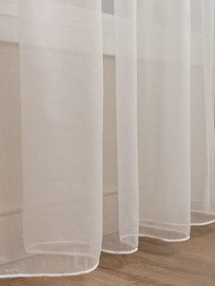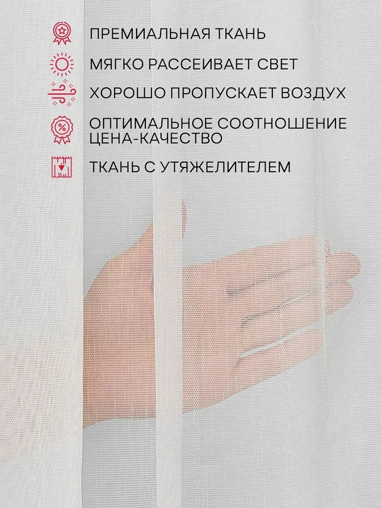 Размер шторы: ширина 500 см, высота 270 см, допуск пошива ±5 см. Рекомендуемый коэффициент сборки — 1:1,5-2. То есть для карниза шириной 2-2,5 метра отлично подходит тюль шириной 4 метра, для меньшего карниза складки лягут плотнее, затеняя комнату.