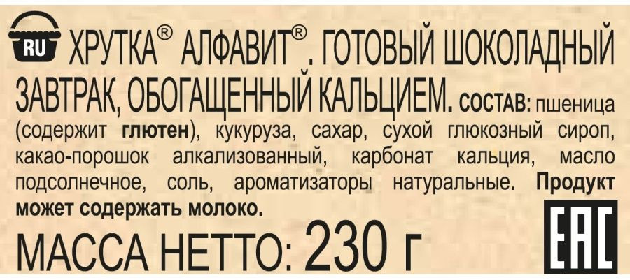 Пшеница (содержит глютен), кукуруза, сахар и сухой глюкозный сироп, какао-порошок алкализованный, карбонат кальция и масло подсолнечное, соль, ароматизаторы натуральные. Продукт может содержать молоко.