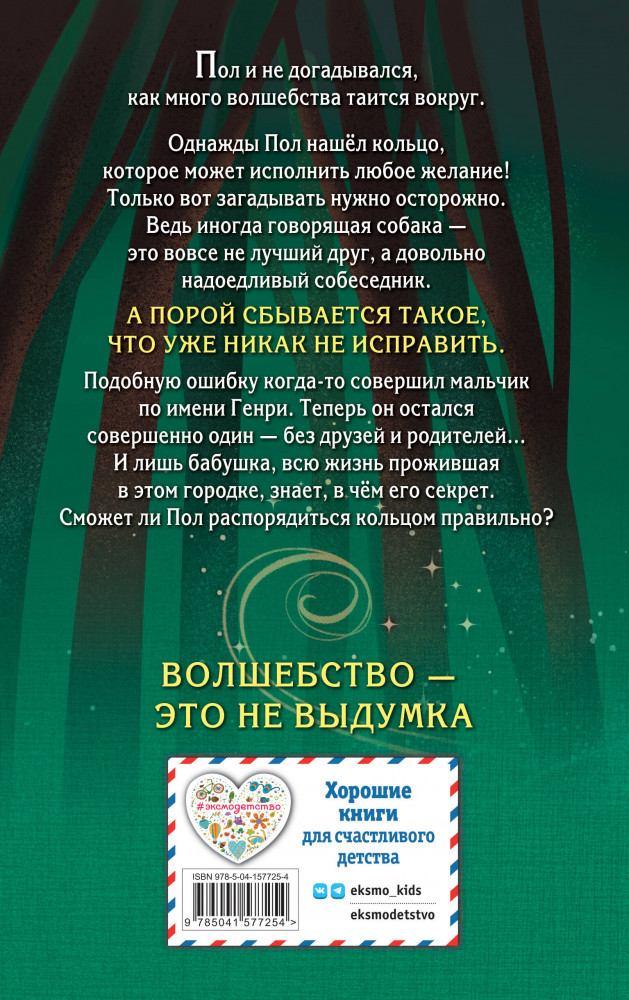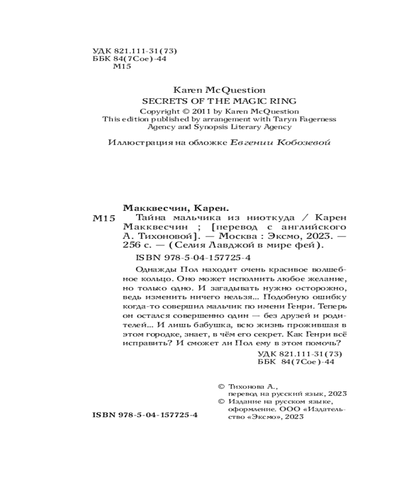 В данный момент этот товар отсутствует в продаже. Возможно, у нас найдется аналогичный или похожий товар здесь. Серия: Детск. Селия Лавджой в мире фей Новая невероятная дилогия в жанре фэнтези от автора бестселлеров Карен Макквесчин. Герой находит кольцо, исполняющее желание, всего одно, поэтому загадывать надо осторожно. Сможет ли Пол помочь предыдущему владельцу исправить последствия непродуманного желания? Благодаря этой истории вы поверите в волшебство!