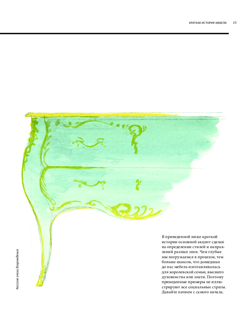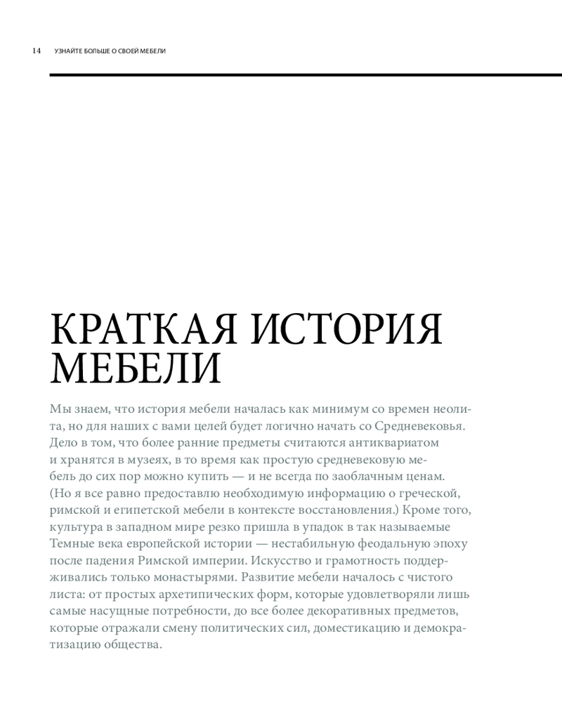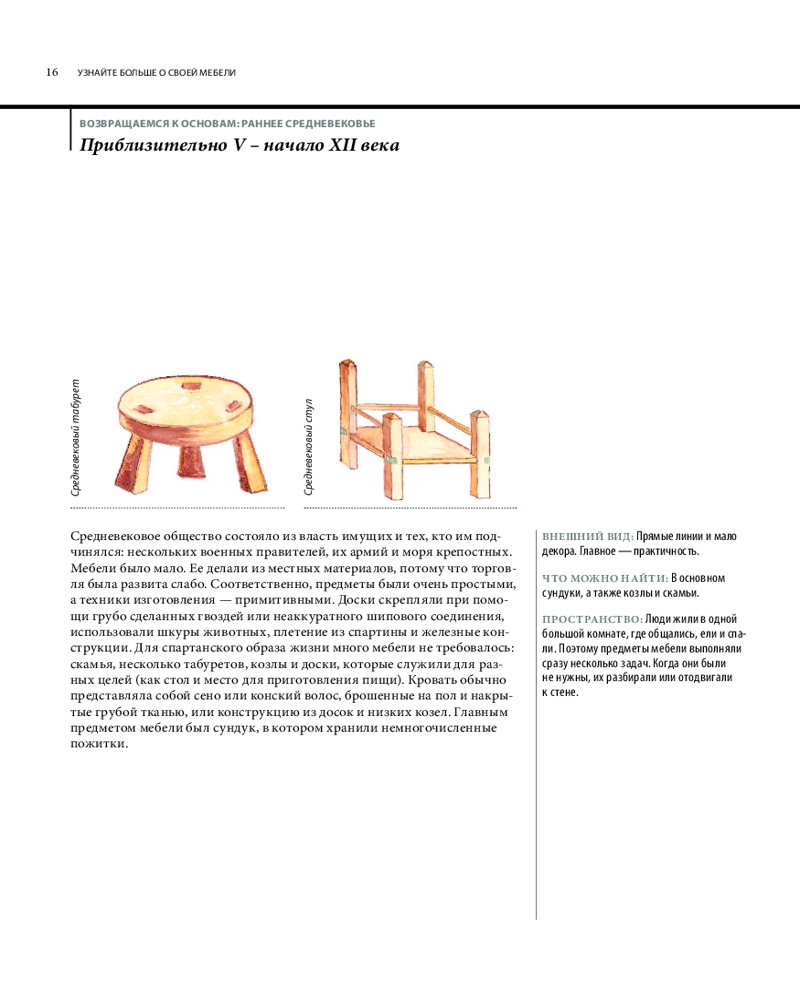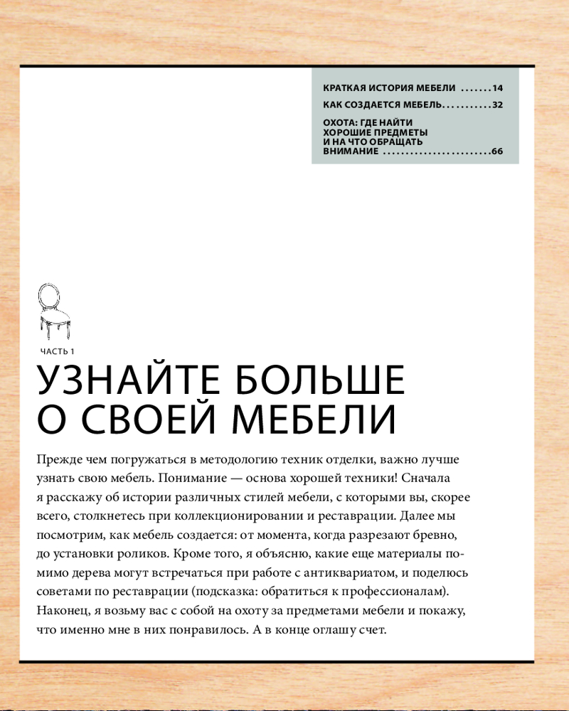 Перед вами откроется история мебели: ее создание, элементы, покрытия, украшения. В главе о создании мебели вы узнаете о том, как и почему используются определенные виды древесины для дна ящиков, передней стенки комодов и ножек стула.
