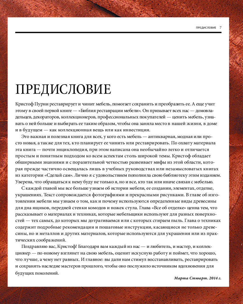 Глава «Всё об отделке» ценна тем, что рассказывает о материалах и техниках, которые мебельщики используют для разных поверхностей — тех самых, до которых мы дотрагиваемся или с которых стираем пыль мягкой тряпкой.