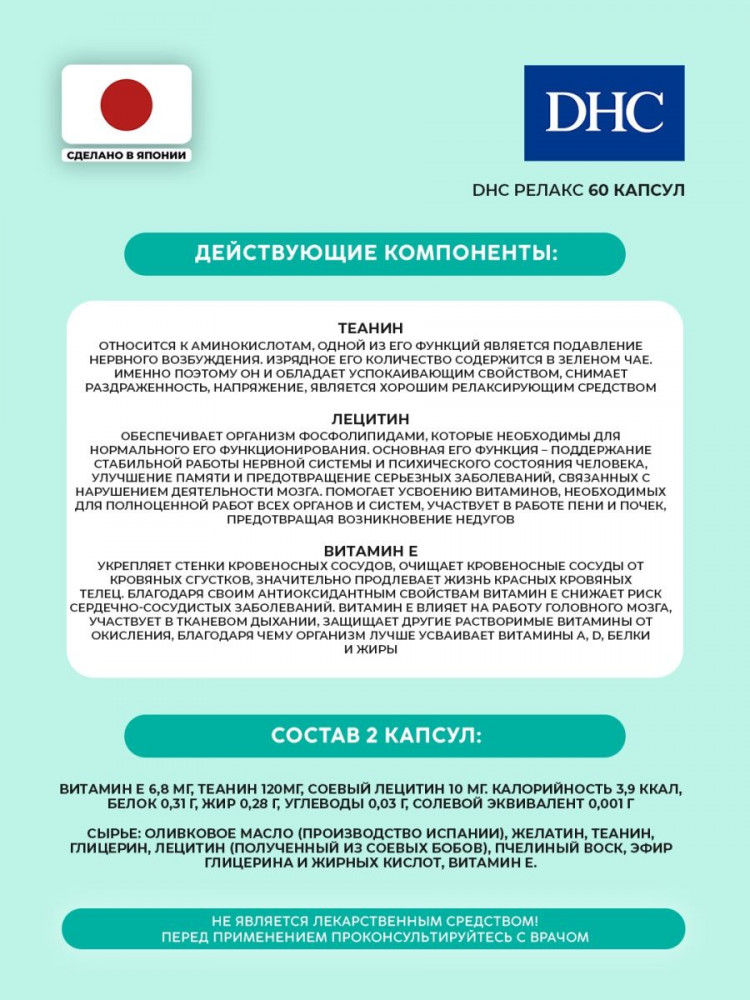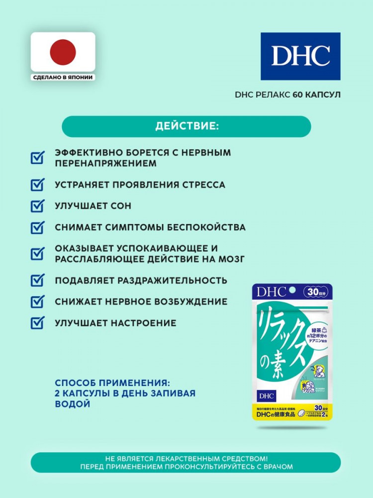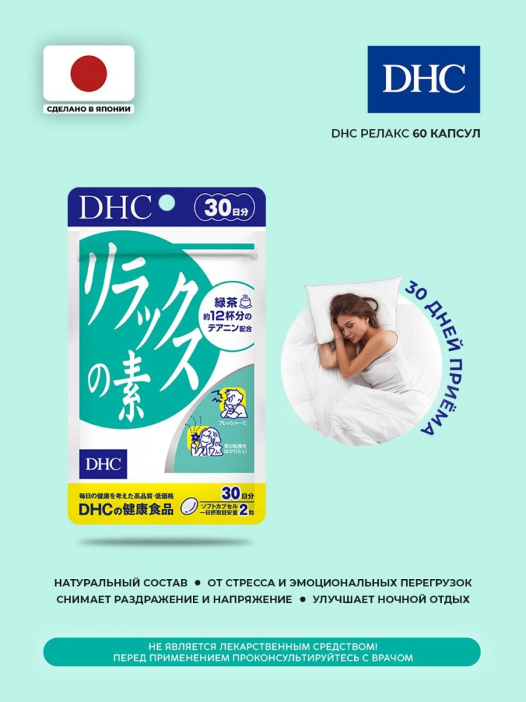 DHC БАД «Релакс от стресса и напряжения»В данный момент этот товар отсутствует в продаже. Возможно, у нас найдется аналогичный или похожий товар здесь. Натуральный продукт с содержанием теанина. Теанин — один из видов аминокислот, содержащихся в зеленом чае, которые подавляют возбуждение и снимают нервное напряжение, успокаивают тело и душу. В состав добавлены оливковое масло, витамин В и соевый лецитин (генетически не модифицированный), которые усиливают действие теанина. После приема препарат действует незамедлительно и является эффективным средством в борьбе со стрессом. Рекомендуется употреблять при постоянном напряжении, больших нагрузках и сильной занятости, при работе с компьютером, неврозах, беспокойстве, нарушении сна. |