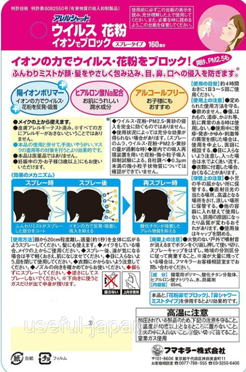 Данный спрей создает вокруг лица защитную оболочку из положительно заряженных ионов, тем самым блокирует попадание пыли, цветочной пыльцы и вирусов на слизистые оболочки носа и глаз. Мягкое распыление не доставит неприятных ощущений при нанесении. Просто распыляя, катионный полимер (положительный ион) покрывает лицо и волосы целиком. Полимеры положительно заряженных ионов создают электростатическое поле на всей поверхности лица, они отталкивают в воздухе и адсорбируют вирусы, пыльцу,желтую пыль для предотвращения попадания в глаза, нос, рот.