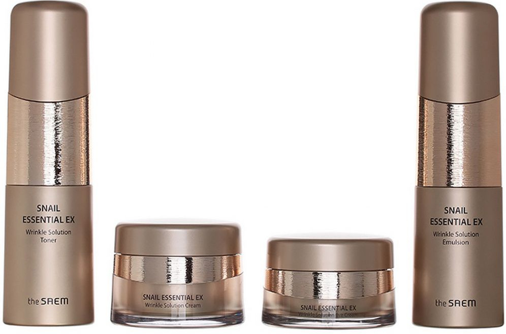 Snail Essential EX Wrinkle Solution Cream: snail mucus filtrate, glycerin, purified water, cyclopentasiloxane, cetyl alcohol, hydrogenated poly (C6-14 olefin), sorbitan stearate, butylene glycol, triethylhexanoin, niacinamide, stearic acid, Isohexadecane, Sanghwang mushroom extract, burdock extract, kava leaf/root/stem extract, sea buckthorn extract, arrowroot extract, licorice extract, peony extract, chrysanthemum extract, hwangbaek extract, royal jelly extract, water-soluble collagen, aloe vera leaf juice, sodium Hyaluronate, hydrogenated lecithin, polysorbate 60, 1,2-hexanediol, dimethicone, dimethiconol, tromethamine, sorbitan sesquioleate, sucrose scocoate, acrylate/C10 -30 Alkyl acrylate cross polymer, glyceryl polymethacrylate, carbomer, ethylhexyl glycerin, disodium EDTA, adenosine, ethanol, cacao pigment, xanthan gum, hydrogenated phosphatidylcholine, isostearyl isostearate , Cholesterol, inulin lauryl carbamate, tocopheryl linoleate, ceramide 3, panthenol, folic acid, potassium cetyl phosphate, raffinose, copper tripeptide-1, hydrogenated polydecene, cetearyl alcohol, phosphoryl Feed, phytosphingosine, ceramide 2, palmitoyl pentapeptide-4, flavoring, phenoxyethanol.