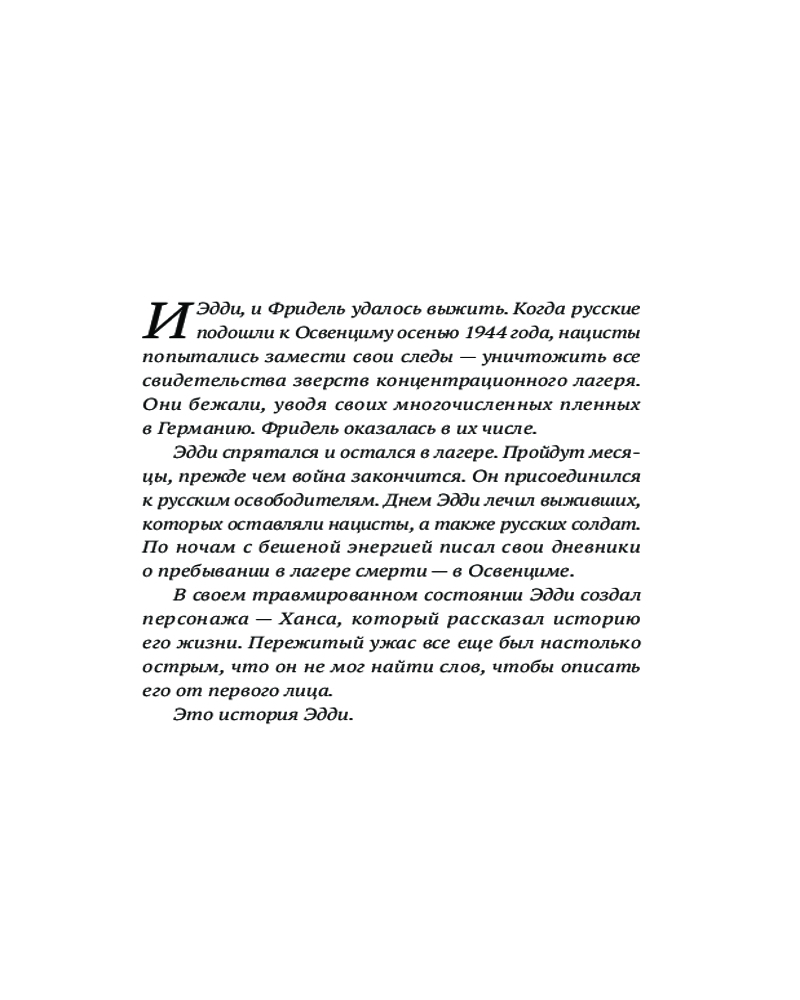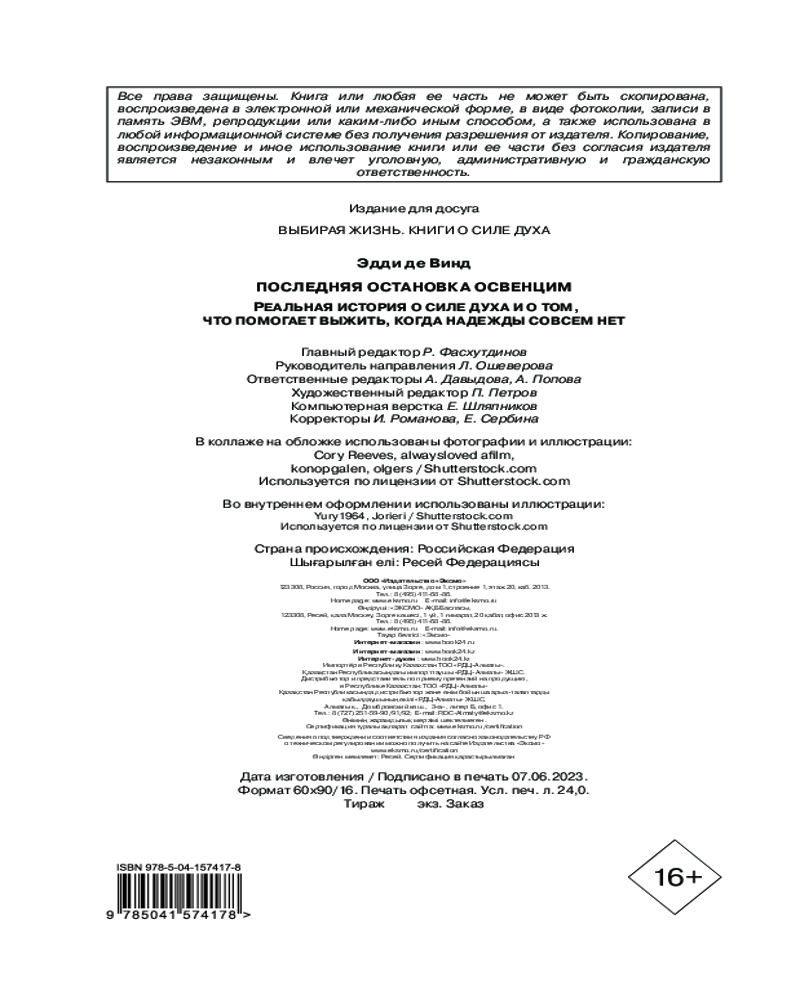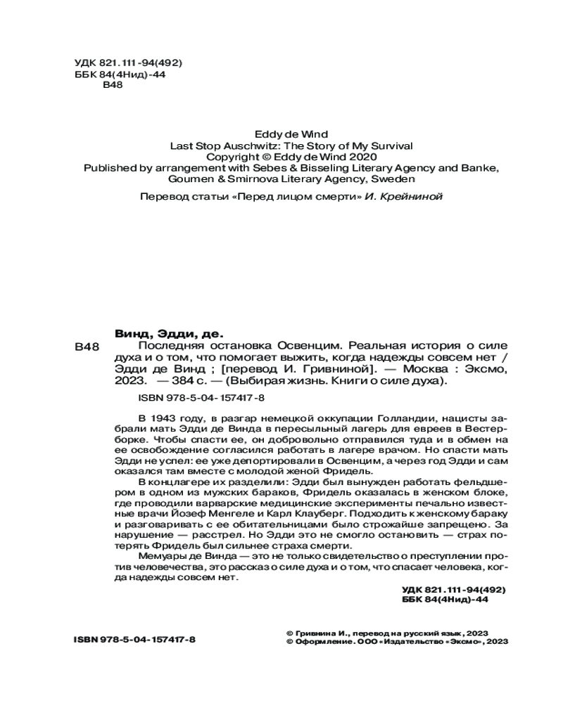 💳 Оплатить за товар можно при получении 🇰🇿 Есть бесплатная доставка по Казахстану от 1 дня 🎁 Копите бонусы с каждой покупки Серия: Выбирая жизнь. Книги о силе духа Мемуары Эдди де Винда, психотерапевта еврейского происхождения из Нидерландов, — это не только откровенный рассказ о том, что ему пришлось пережить в Освенциме, но и трогательная история надежды и любви, мудрое размышление о природе добра и зла, на которые способны люди. А еще эта книга — важный исторический документ, свидетельство силы человеческого духа и предостережение от тех глубин, в которые мы можем погрузиться, если предрассудки обретут силу. |