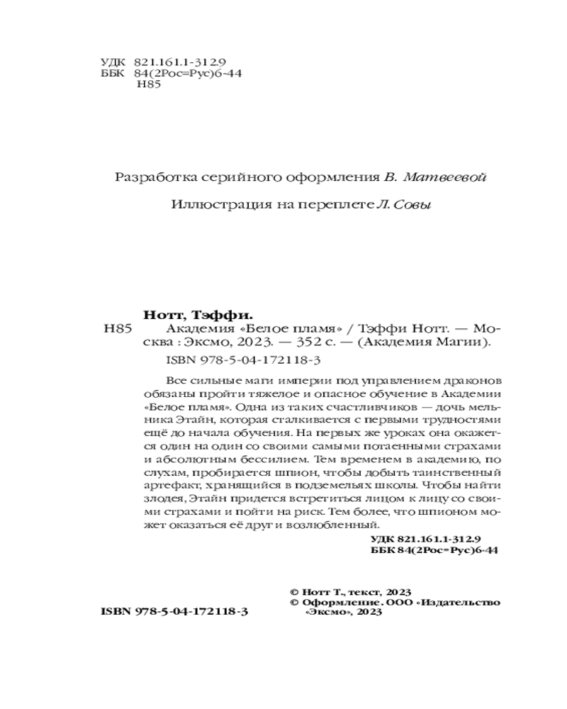 💳 Оплатить за товар можно при получении 🇰🇿 Есть бесплатная доставка по Казахстану от 1 дня 🎁 Копите бонусы с каждой покупки Серия: Академия магии Все сильные маги империи под управлением драконов обязаны пройти тяжелое и опасное обучение в Академии «Белое пламя». Одна из таких счастливчиков — дочь мельника Этайн, которая сталкивается с первыми трудностями еще до начала обучения. На первых же уроках она окажется один на один со своими самыми потаенными страхами и абсолютным бессилием. Тем временем, в академию, по слухам, пробирается шпион, чтобы добыть таинственный артефакт, хранящийся в подземельях школы. Чтобы найти злодея, Этайн придется встретится лицом к лицу со своими страхами и пойти на риск. Тем более что шпионом может оказаться ее друг и возлюбленный. |